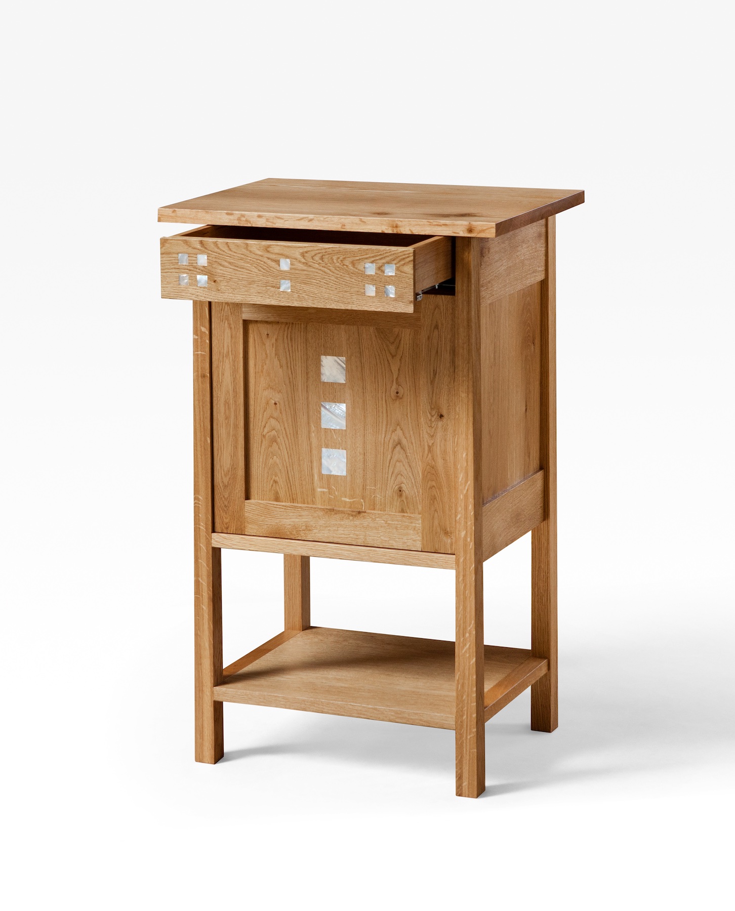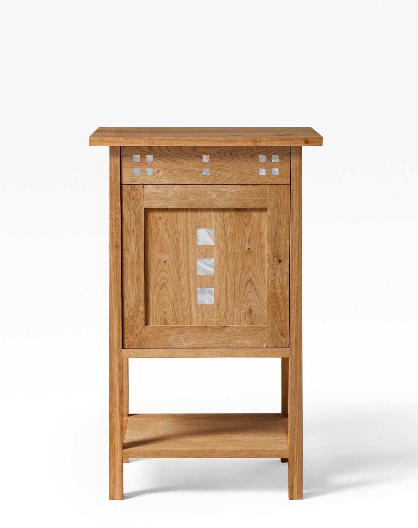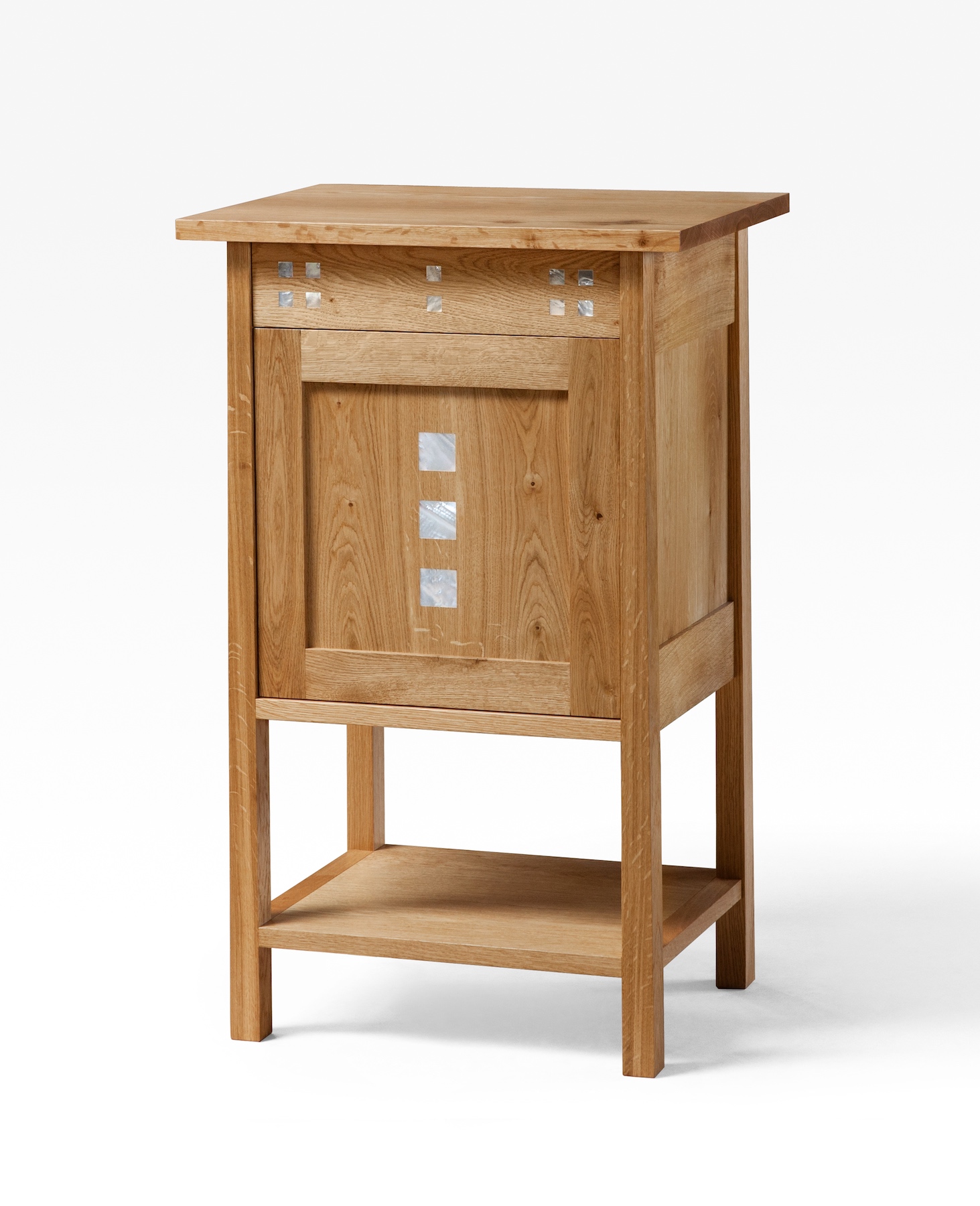 A lovely side table showing distinctive Rennie Mackintosh influence with Mother of Pearl inlays, shown here in reclaimed Oak.