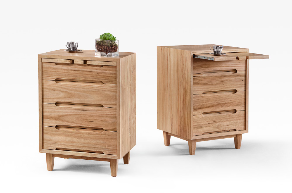 A reworking of a classic Mid Century Bedside Chest with 4 drawers and handy inbuilt Coffee slide. Handmade entirely from your choice of solid timbers