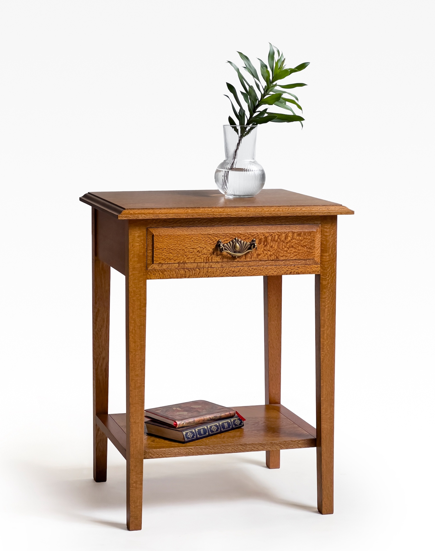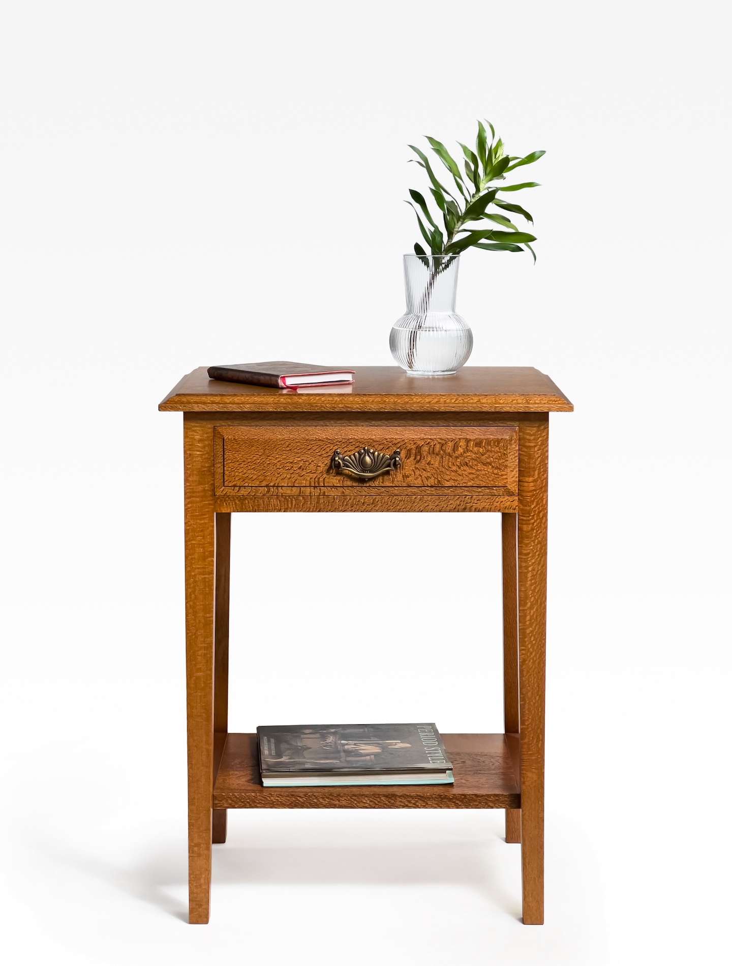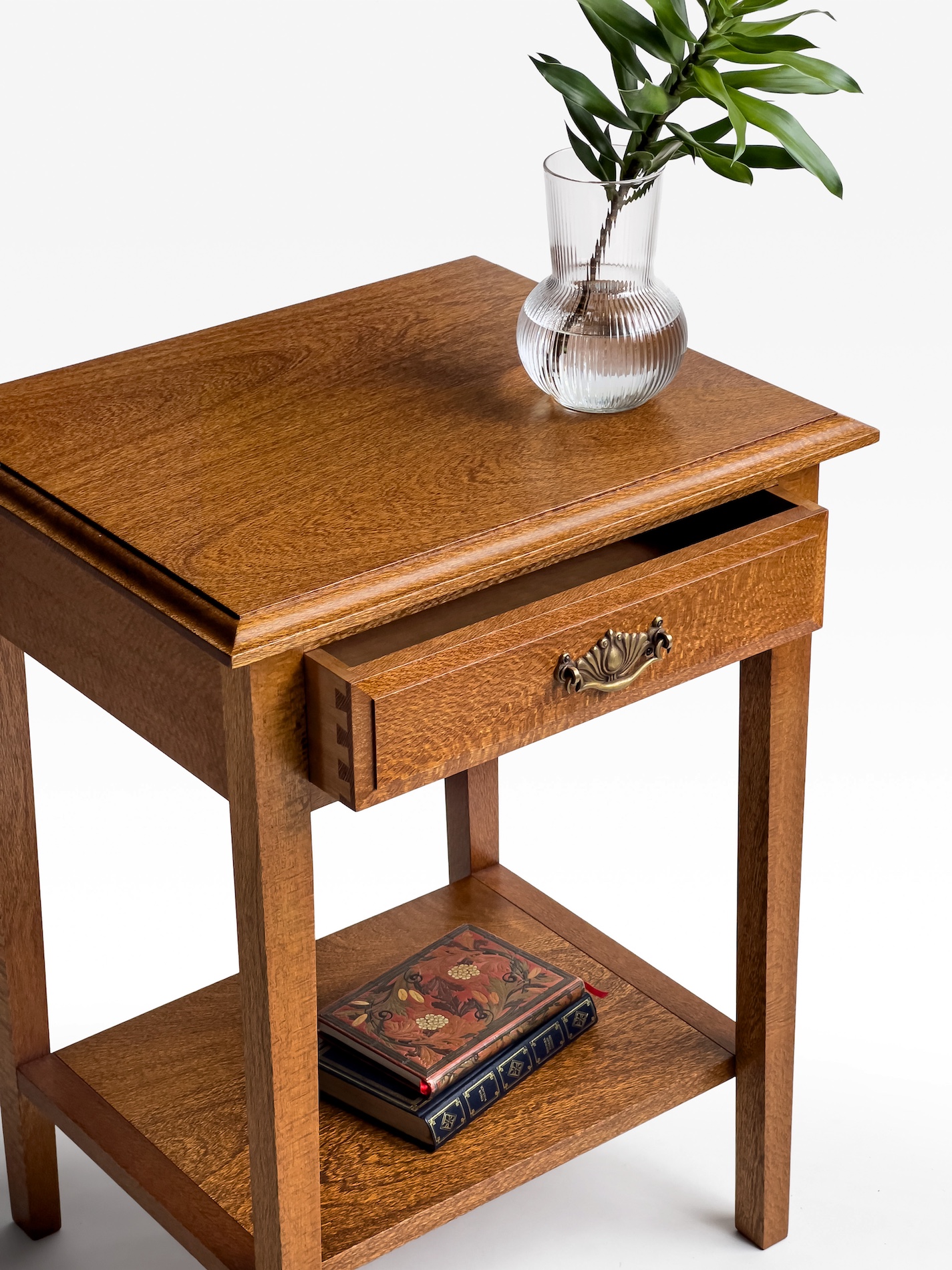 Silky Oak bedside table with single drawer and open shelf. A fresh design that retains some fine detailing that combines both ‘old and new’.