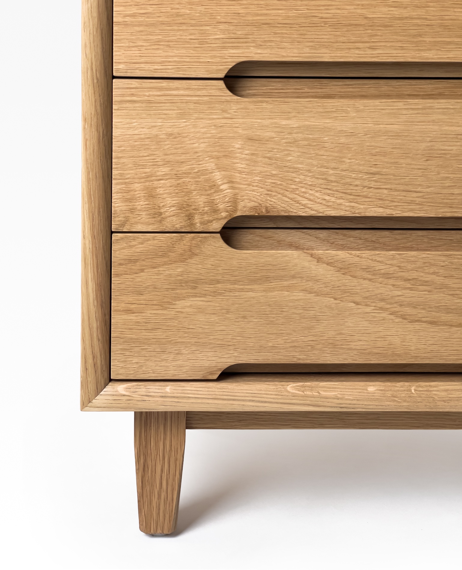 Shaped finger recesses offer a nice finishing touch to the drawers and top slide.
